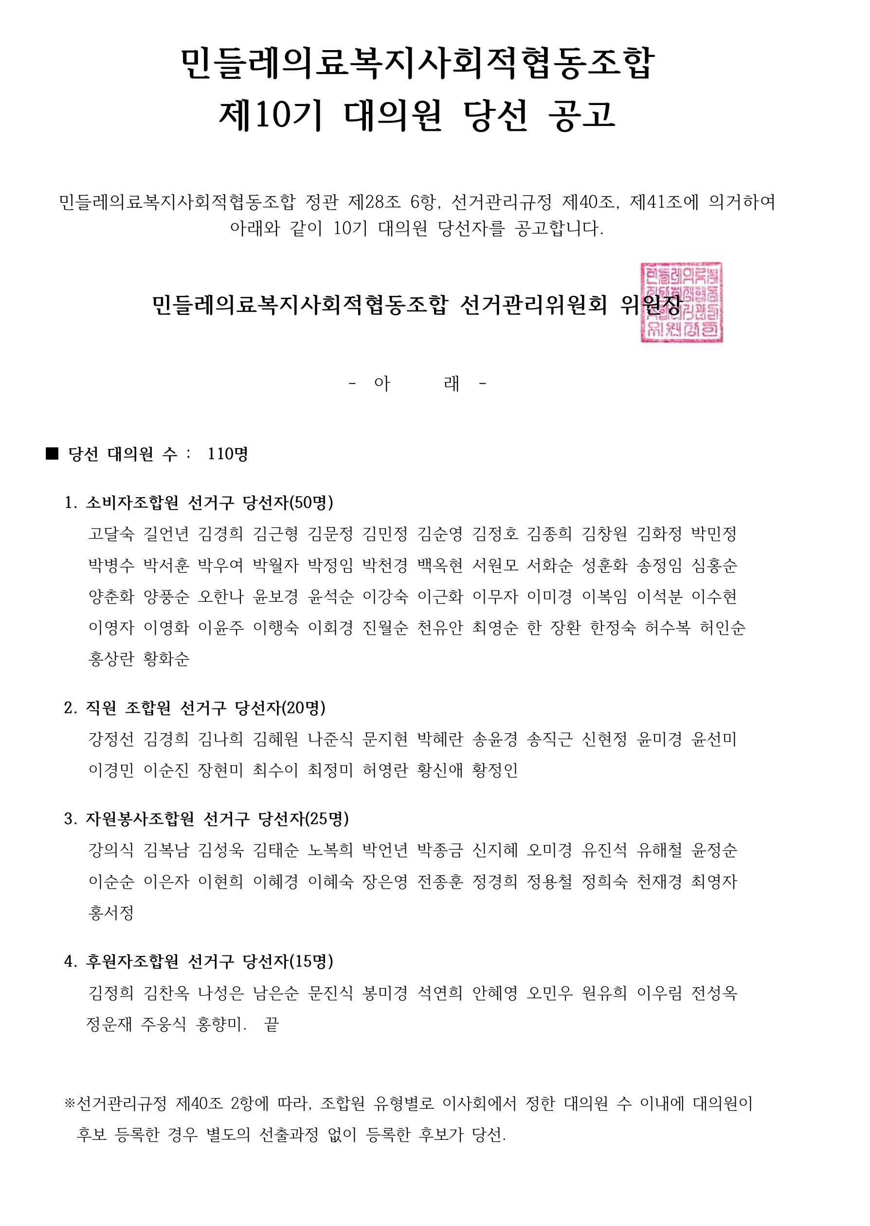 제10기 대의원 당선 공고